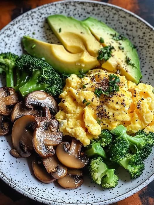 A high-protein, low-carb, anti-inflammatory breakfast or light meal made with fluffy scrambled eggs, creamy avocado, sautéed mushrooms, and tender broccoli — clean, nourishing, and satisfying 🌿✨