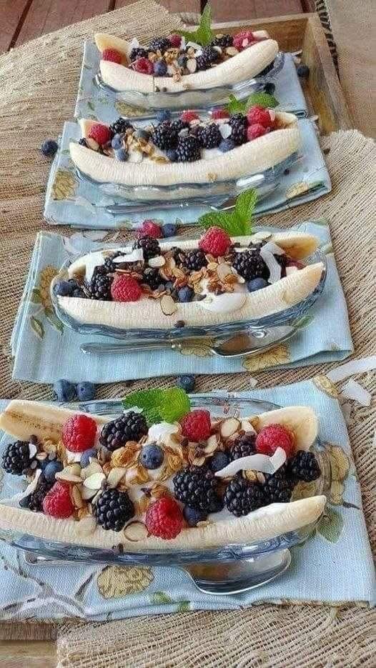 A fresh, no-bake healthy dessert featuring ripe bananas filled with creamy yogurt and topped with mixed berries, nuts, and a drizzle of honey. Perfect for breakfast, snack, or light dessert.