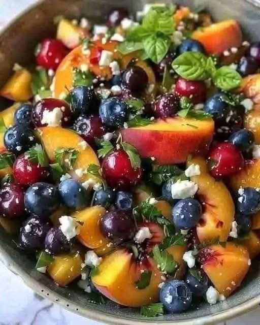 This salad balances sweet summer fruit with creamy, tangy feta and crisp greens, finished with a bright citrus dressing. It’s refreshing, colorful, and perfect as a light meal or side dish.