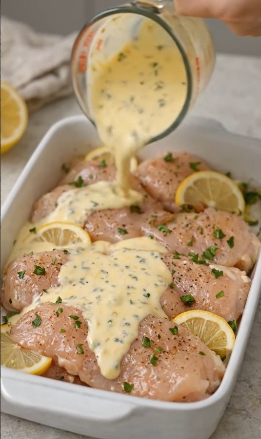 Place chicken in the baking dish and pour the creamy lemon sauce over the top.
