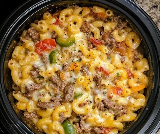 Add beef, bell peppers, onions, mushrooms, uncooked macaroni, beef broth, milk, garlic powder, onion powder, and cream cheese. -