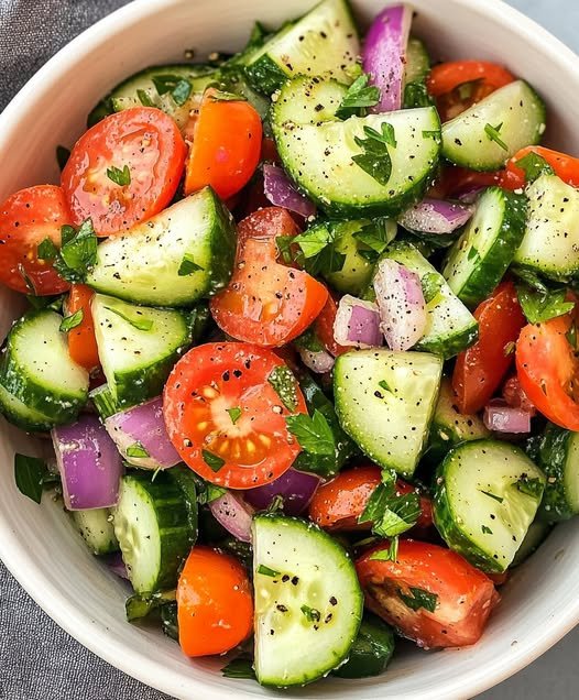 Bright, crunchy, and ultra-refreshingβthis salad is a straight classic that never misses. Juicy tomatoes, crisp cucumbers, sharp red onion, and fresh herbs all tossed in a simple dressing. Itβs light, zesty, and perfect as a side or a quick healthy bite.