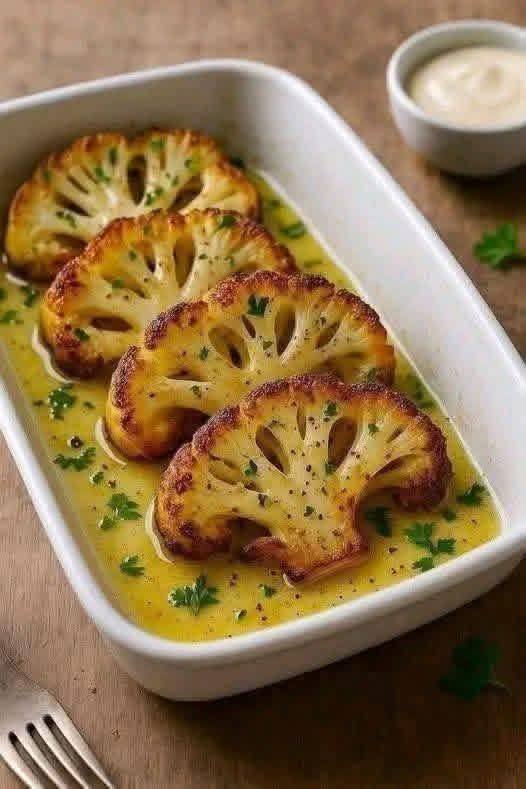 Pour over cauliflower steaks.