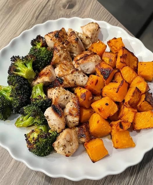 Plate grilled chicken with roasted broccoli and sweet potatoes.