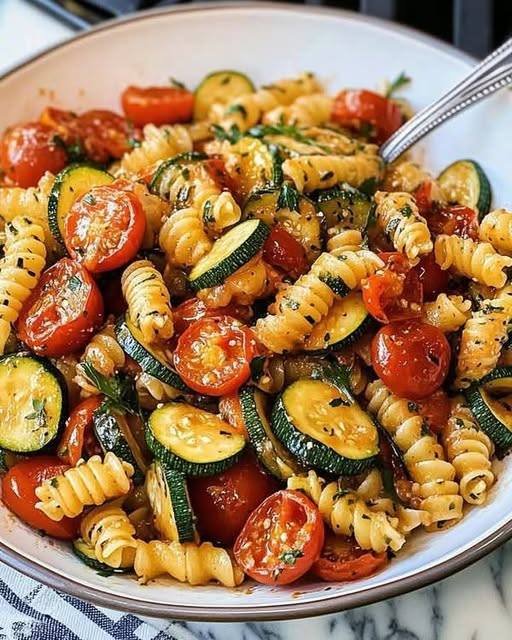 Toss in zucchini noodles and pasta. Cook 2β3 minutes until just tender.