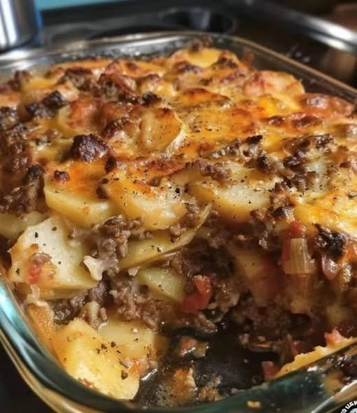 • Spread half of the meat mixture over potatoes.