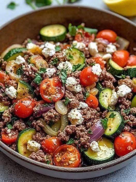 Savory ground beef cooked with garlic, tomatoes, herbs, and vegetables, finished with olives and feta. This one-pan Mediterranean dish is comforting, protein-rich, and ready in under 30 minutes.