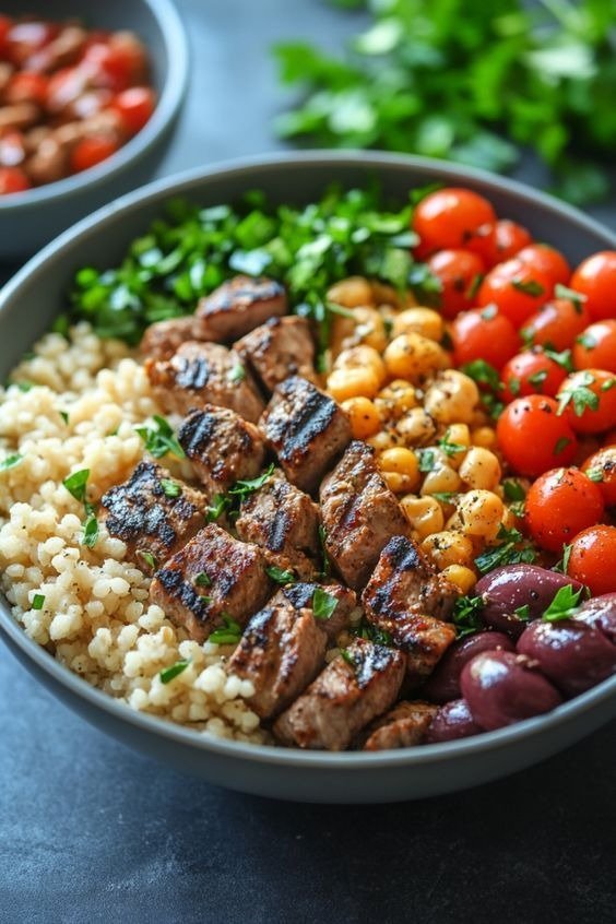 A balanced, vibrant bowl with juicy grilled steak, fluffy couscous, crisp veggies, and a zesty Mediterranean dressing—perfect for meal prep or a satisfying dinner!