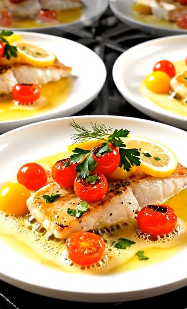 This elegant yet simple dish features flaky pan-seared cod bathed in a silky lemon-butter sauce, finished with juicy burst cherry tomatoes and fresh herbs. It’s light, fresh, and restaurant-quality, yet ready in under 20 minutes — perfect for weeknights or entertaining.
