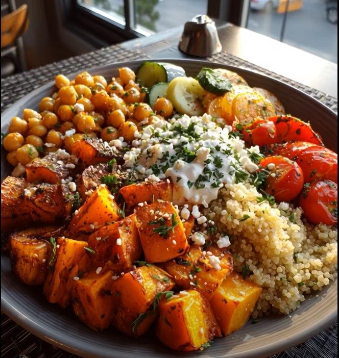 A vibrant Mediterranean-style bowl filled with roasted sweet potatoes, crispy chickpeas, fresh vegetables, creamy feta, and a light lemon-tahini or yogurt dressing. It’s nutritious, vegetarian, and packed with flavor.